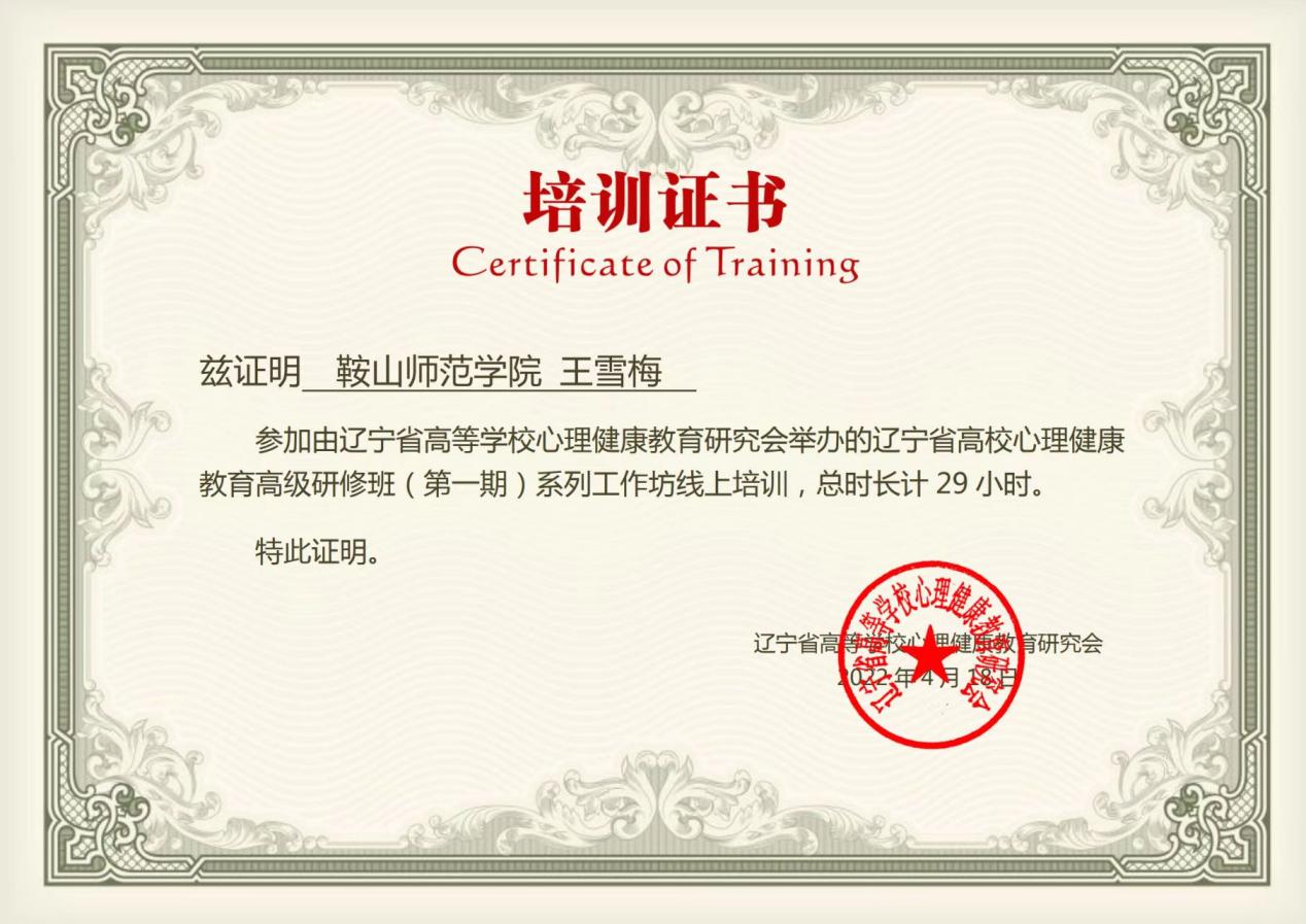 1 | 辽宁省高校心理健康教育高级研修班 | 王雪梅 | 388vip太阳集团 | 副教授 | 2022.4.18 |