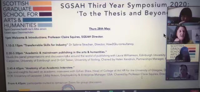 (二)2020年5月28日-29日苏格兰艺术与人文研究生协会三年级研究生专题调研会线上 该会议系英国苏格兰研究生协会艺术与人文分会针对三年级博士研究生研究方法进行的专业培训与成果交流。会议集中培训并展示苏格兰艺术与人文研究中使用的主要研究方法如个案研究、行动研究、田野研究和民族志研究方法。同时该会议对优秀研究方法个案及其主要成果进行了展示、交流和讨论。邢丹同志认真学习了主要研究方法,并在分组讨论中进行了积极讨论与互动。