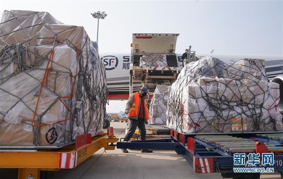 1月28日,工人在武汉天河机场卸货。当日,武汉天河国际机场共有3架全货机满载医疗防疫物资抵港,包含医用口罩、医用帽子、乳胶手套、防护服、消毒液等各类防护用品及医疗药品,共计60余吨。新华社记者 程敏 摄