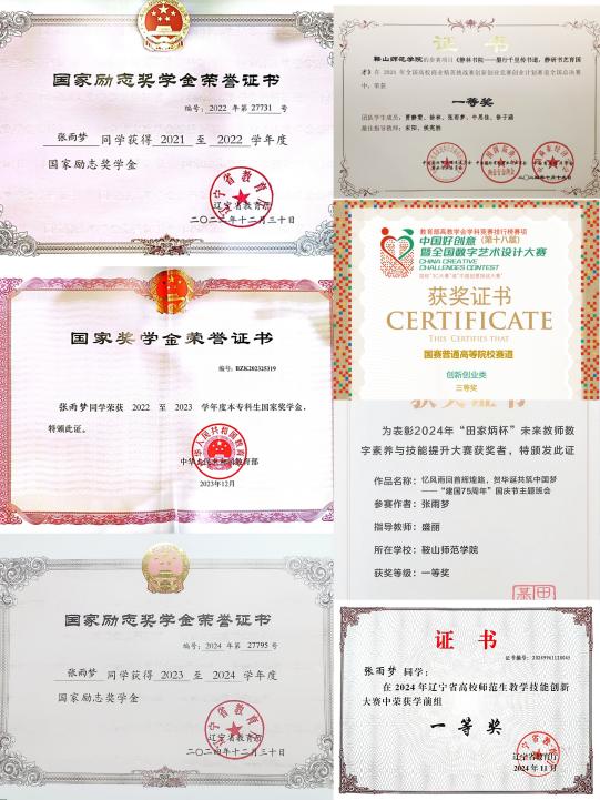 在学习方面,学习成绩和学风杯成绩在本专业排名第一,获得国家励志奖学金两次,国家奖学金一次,取得了幼儿园及中职专业课(学前教育)教师资格证书、普通话二级甲等证书、大学英语四级和六级证书;在实践方面,累计获得国家级奖项6项,省级及以上奖项16项,如全国高校商业精英挑战赛一等奖、2024“田家炳杯”未来教师数字素养与技能提升大赛一等奖等;在科研方面,主持省级大创项目1项、参与国家级大创项目1项并顺利结项,作为第一作者于国家级刊物发表论文1篇,作为第二作者于省级刊物发表论文1篇,参与市级教师科研项目1项。