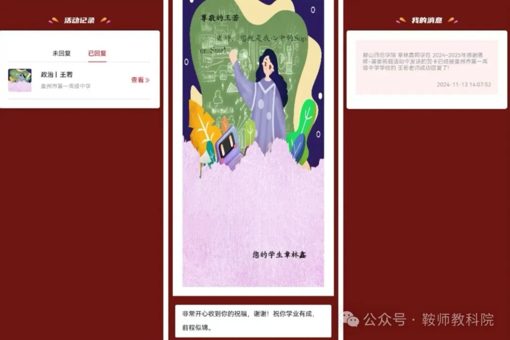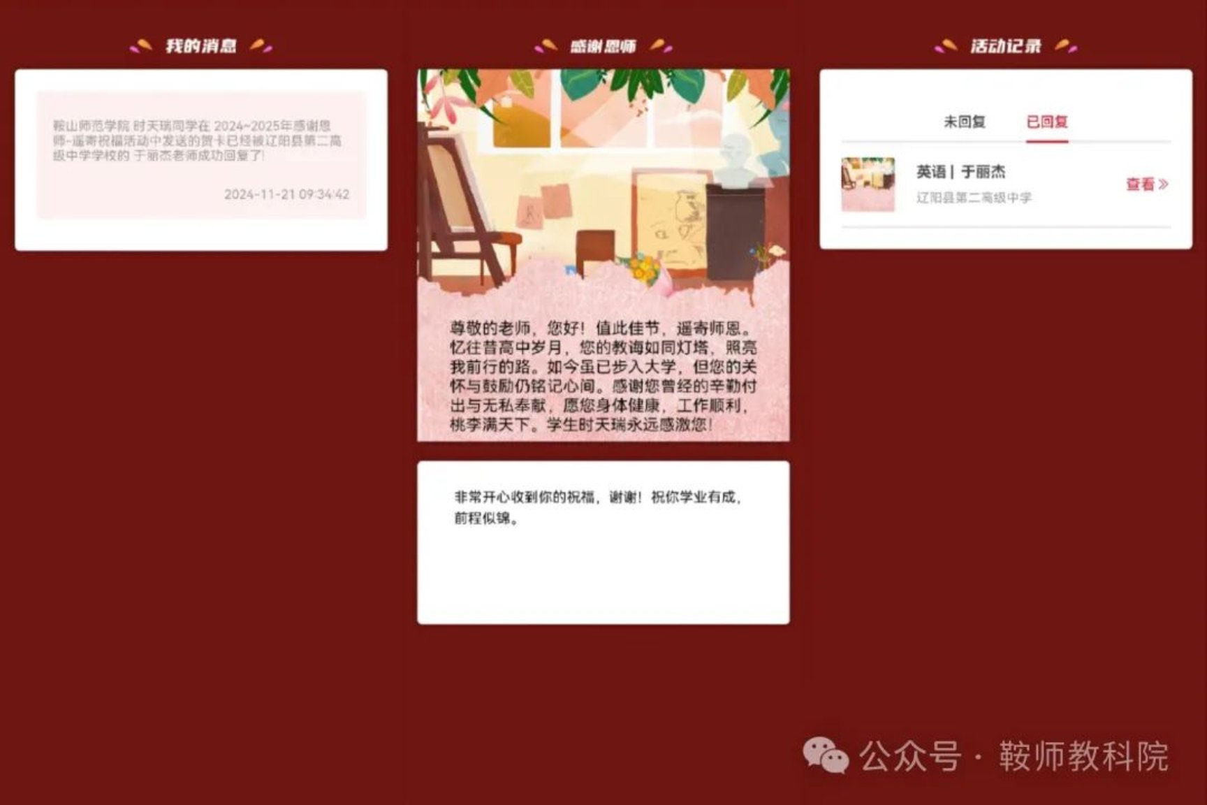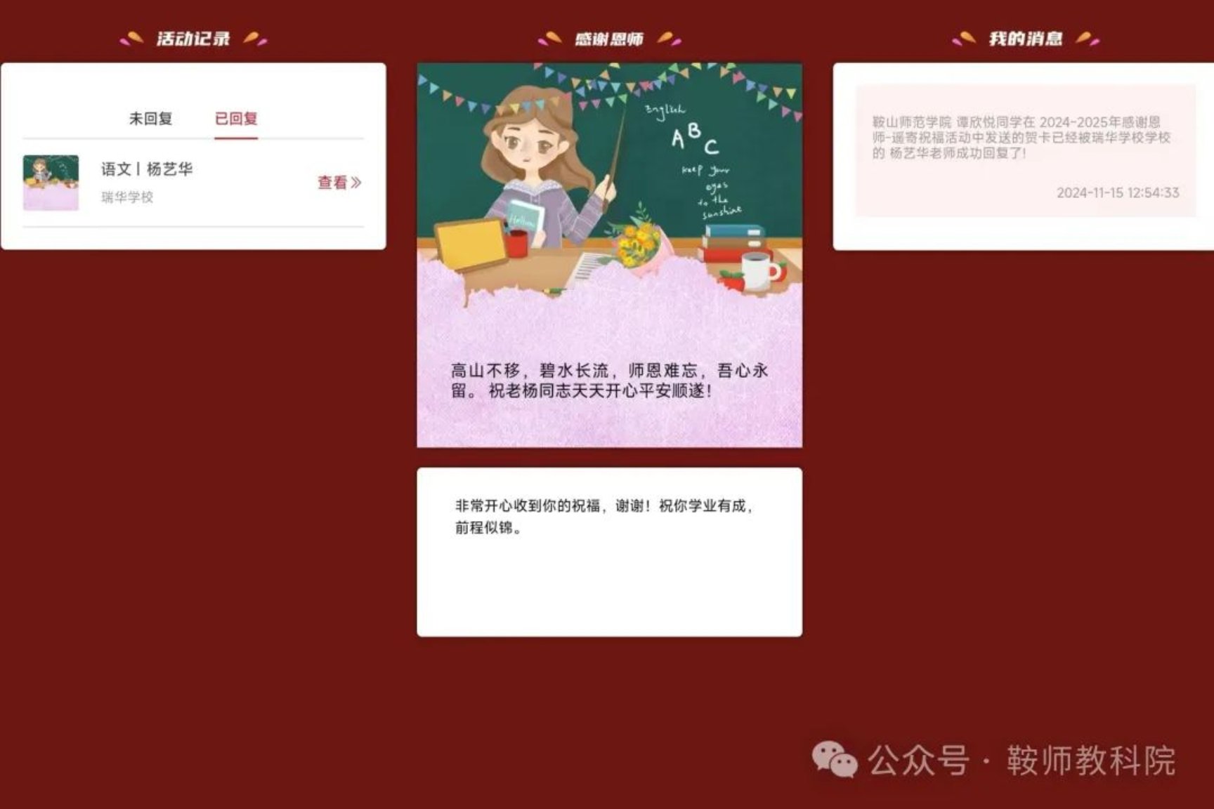 活动分为“遥寄祝福”与“作品征集”两部分。在“遥寄祝福”中,近百名同学们通过线上贺卡的方式为恩师献上了真诚的祝福和衷心的感谢,并且收到了恩师的回复寄语。这些卡片共同见证了师生们发自内心互相真诚祝福的时刻,无论相隔多远,学生对老师的思念都无穷无尽,老师对学生的祝福也都会从遥远的彼岸传来。让我们一起来读读这些诚挚的祝福语吧!