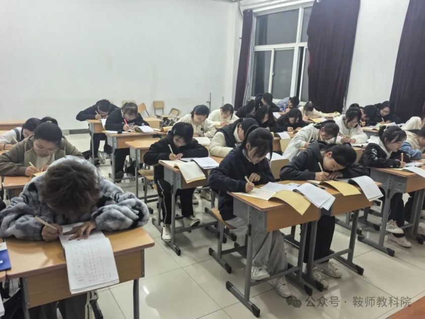 为充分发挥五育融合育人实效,建设高素质专业化师范生队伍,营造学院推广普通话氛围,倡导师范生勤练教学基本功,促进师范生“三笔一话”日常从教技能练习常态化、长期性开展。晚自习期间,教科院组织推普、《学记》背诵与“三笔字”训练。