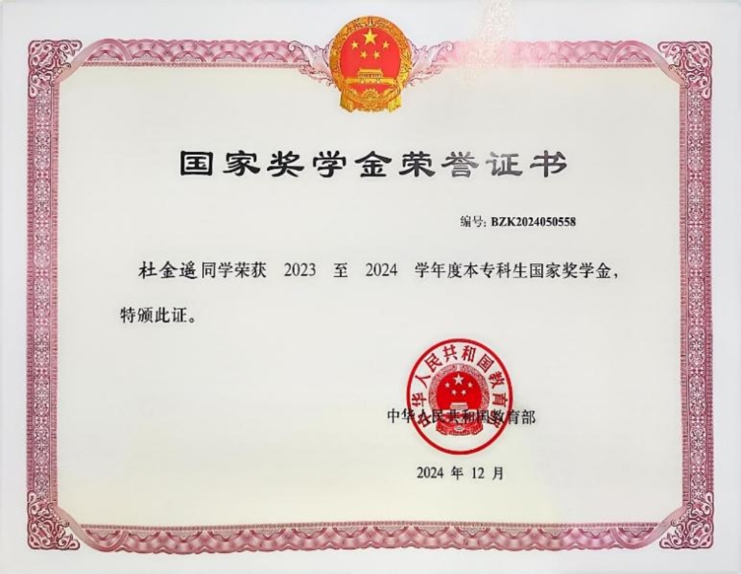 她勤奋刻苦,求知欲强,独创“三段式学习法”;课前预习思维导图,课堂实时问答互动,课后疑问深探究。四年以来,她成绩名列前茅,并以专业前5%的成绩于2024年12月获得国家奖学金。并如愿考入了她理想的院校—延边大学。“不止于前,不止于此。”未来她也将会以谦逊的态度不断学习,扎实基础,争取取得更加优异的成绩。