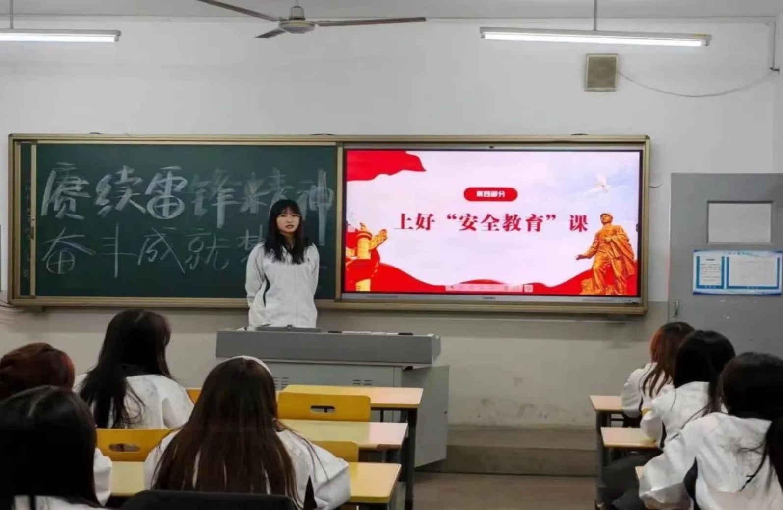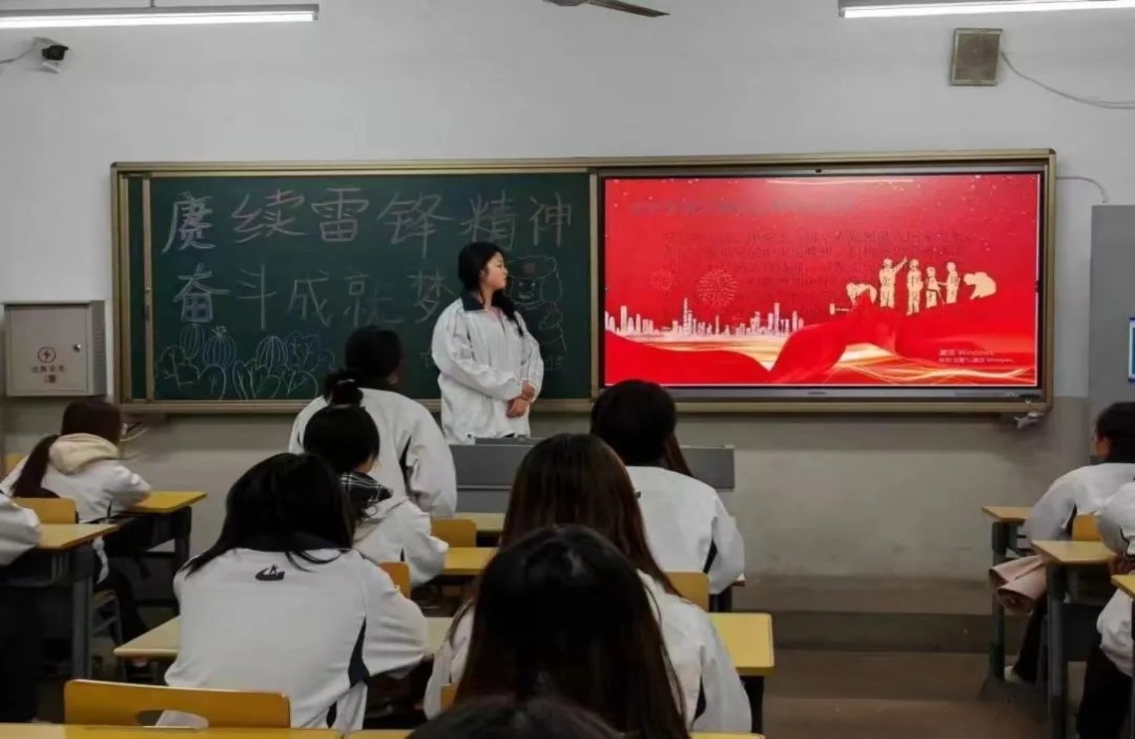 在清扫教学楼活动中,同学们分工明确,一丝不苟,整齐摆放桌椅,认真扫地拖地,仔细擦拭黑板。在高标准、高质量地完成志愿清扫的同时,宣传环保知识,积极响应习近平生态文明思想,推动学雷锋活动长效开展,鼓励学生用实际行动在以中国式现代化推进中华民族伟大复兴的使命任务中贡献青春力量,做新时代追“锋”人。