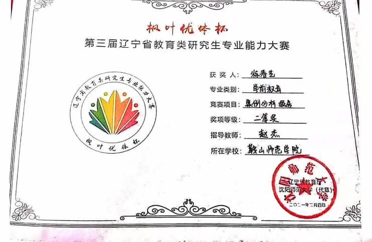 7.在2021年指导学生于枫叶优体杯第三届辽宁省教育类研究生专业能力大赛荣获二等奖。