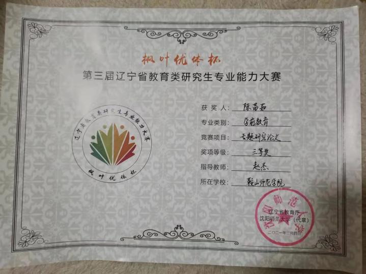 3.在2021年指导学生于枫叶优体杯第三届辽宁省教育类研究生专业能力大赛荣获三等奖。