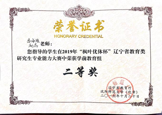 2.在2019年指导学生于“枫叶优体杯”辽宁省教育类研究生专业能力大赛中荣获学前教育组二等奖。