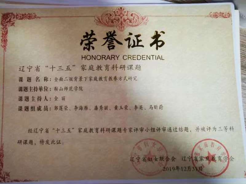 3.在2019年辽宁省“十三五”家庭教育科研课题荣获三等奖。