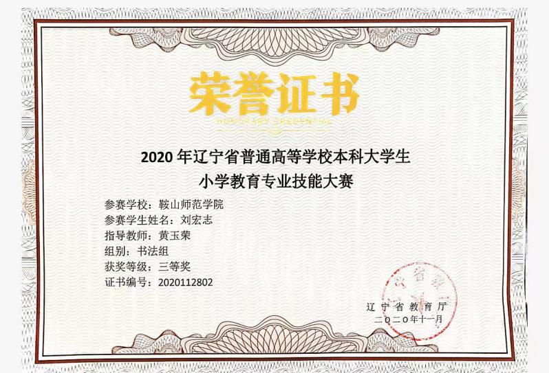 6.在2020年指导学生在辽宁省普通高等学校本科大学生小学教育专业技能大赛荣获三等奖。